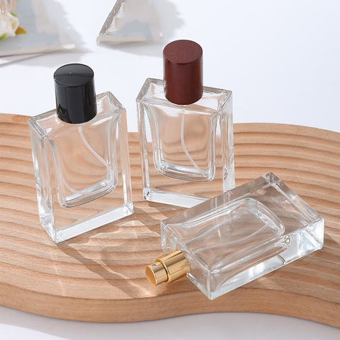 Botella de perfume de clase al por mayor Botella de vidrio de 50ml Botella de perfume de lujo con tapa cuadrada y spray